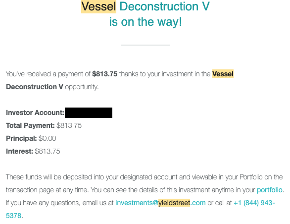 This seemed so great, I told my wife about. They had a track record over years through 4 other funds of the same type that had all returned without a hitch. My wife loves cash flow, so although I wanted to put in $90,000, she wanted to go to $250,000! I convinced her that was a bit much for our first time on this type of investment, and she agreed to back down to the $90K. So that’s what we did, we invested $90,000 in the Greek ship deconstruction fund. Here’s the email I got: