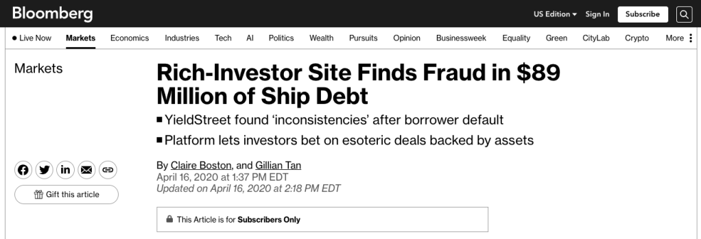 I was contacted by an Attorney that told me they were getting investors together to sue Yieldstreet. As the broker, they completely failed in their due diligence process to vet this company, and misrepresented the risks grossly. I told the Attorney I was happy to join in.