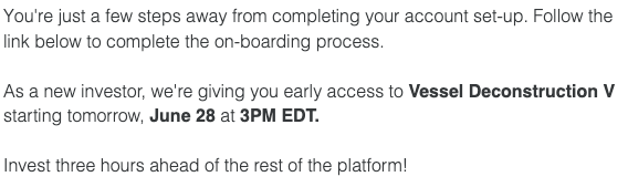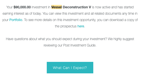 We were excited about this deal, and so we went looking for more opportunities. There was this class of investment that I had seen over years of logging into the site… something about boat deconstruction? There was a splashy item on the home page that the Vessel Deconstruction V was going to launch soon, and double-clicking in I learned that they were prioritizing investors that had not had the opportunity to participate in funds I – IV. Here’s a screenshot of the text inside the email I received, this was in 2019: